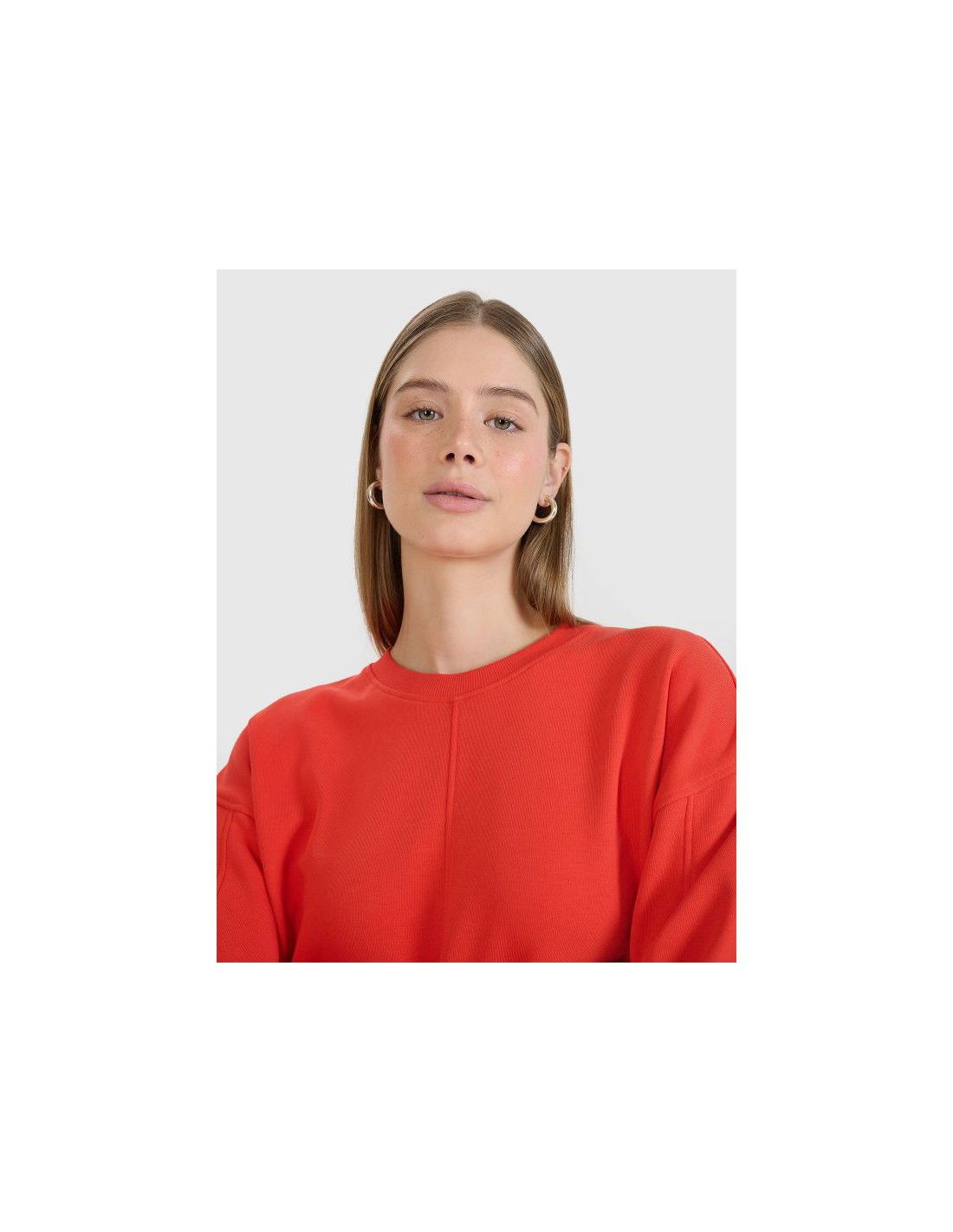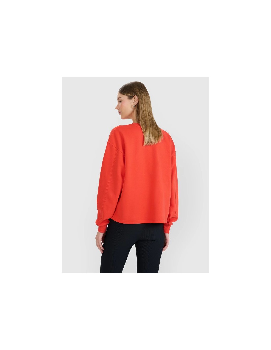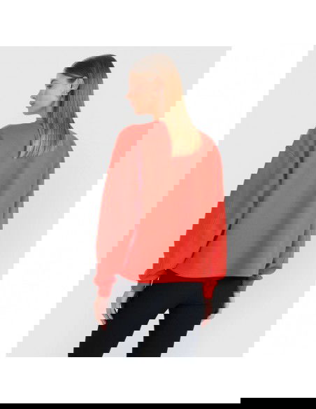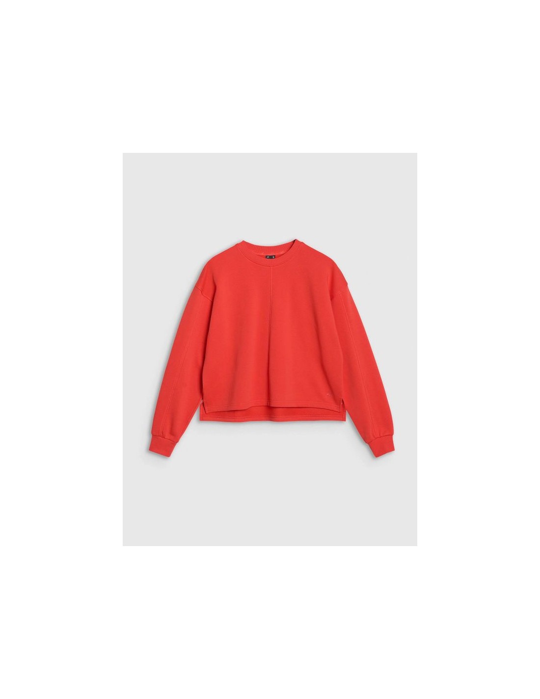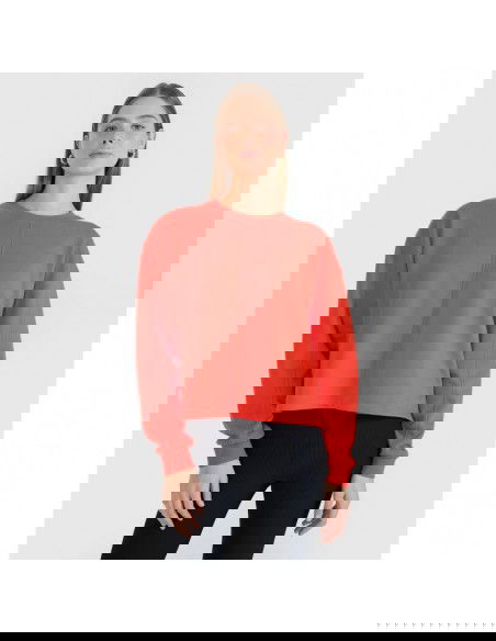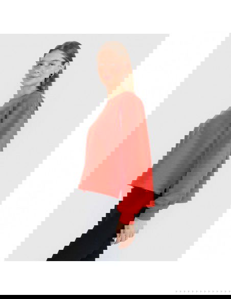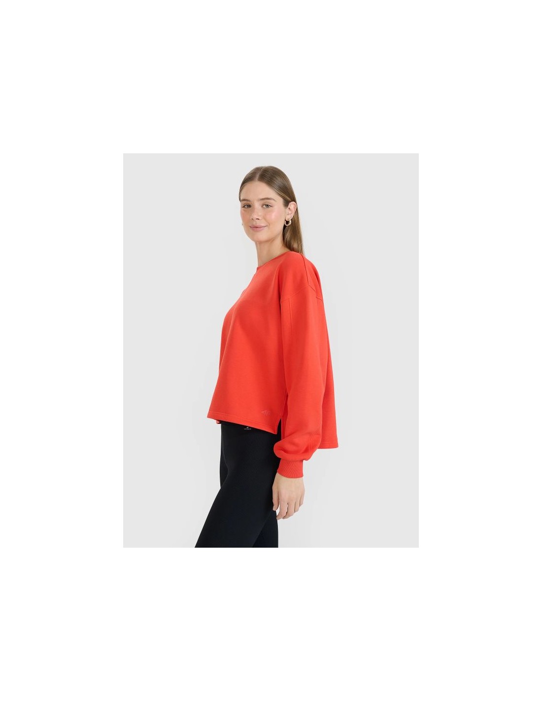 Women's sweatshirt without a hood - comfort and style for everyday use The 4F women's hooded sweatshirt is the perfect choice for casual and sporty styles . The oversized cut provides a relaxed , loose fit for all-day comfort . Made of 320 gsm French terry fabric, it's soft yet breathable . The material is 85% cotton , making it durable and soft to the touch, while 15% polyester adds strength and helps maintain its shape for longer. Key features of the sweatshirt: Weight 320 gsm – soft, medium-thick and breathable fabric Size range XS-XL – wide selection for different body shapes Oversize cut – loose and comfortable style Standard length – reaching to the hips 85% cotton, 15% polyester – durability and comfort of use French terry knit fabric – smooth on the outside, with a looped weave on the inside Round neckline with light ribbing Ribbed cuffs for a snug fit Slips on over the head – a comfortable way to wear Dropped shoulder line – a fashionable, casual look Side slits – increased freedom of movement Solid colors – easy to combine with other wardrobe items