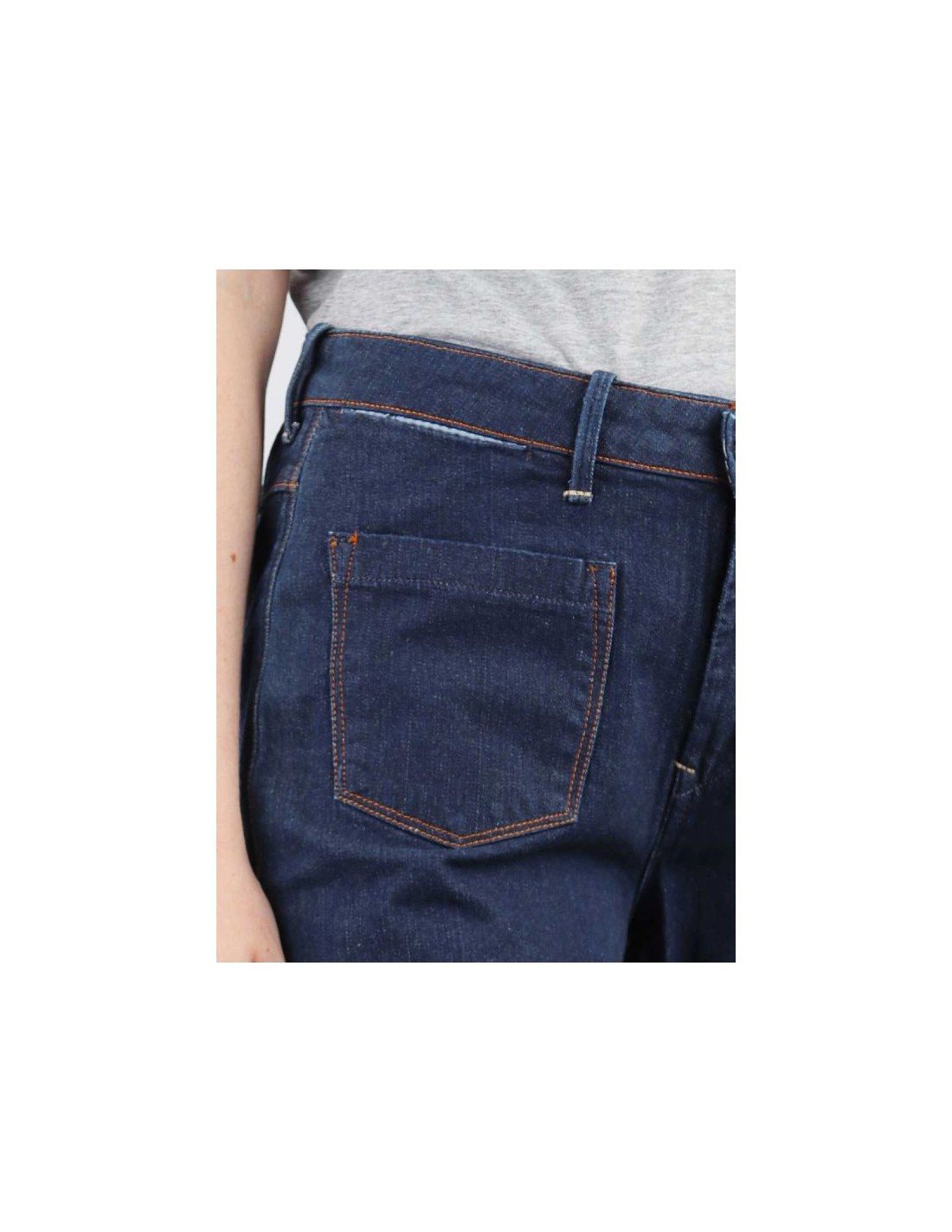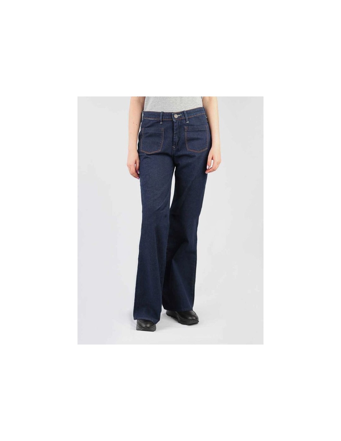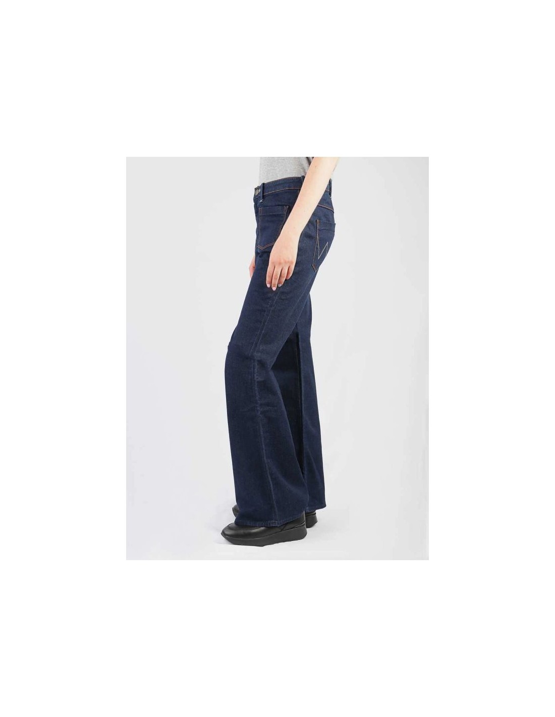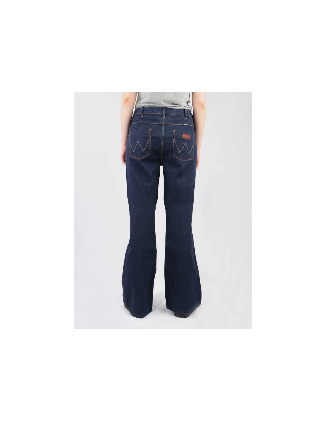 Wrangler Timeless Indigo W245GQ594 Women's high-waisted jeans with wide legs. Zipper and button closure. Brand logo patch on the back pocket. Material: 98% Cotton, 2% Elastane